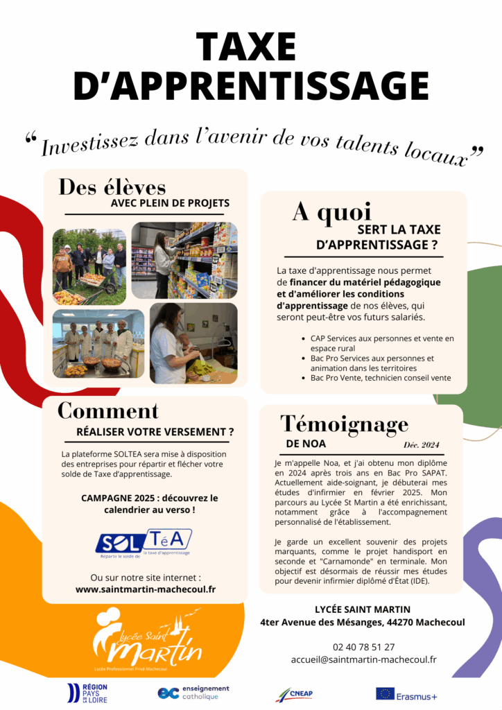 Les entreprises partenaires du Lycée Saint-Martin devront se connecter à la plateforme Soltéa à partir du 26 mai 2025 pour répartir et flécher leur solde de Taxe d’Apprentissage.